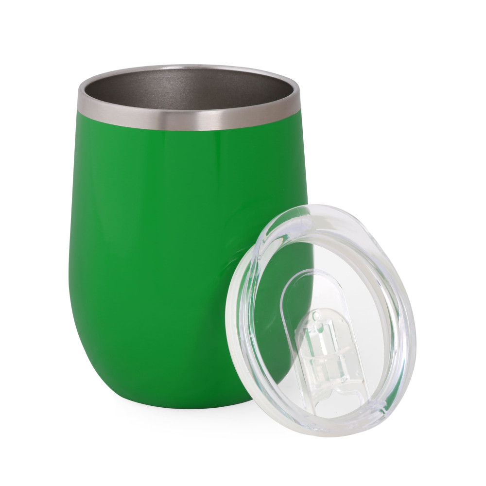 Металева термочашка з подвійними стінками з нержавіючої сталі ( глянцеве покриття емаль) і пластиковою прозорою кришкою з зсувним клапаном. Об'єм 350 мл. Індивідуальна картонна подарункова коробка. Розмір індивідуальної коробки: 12,5 х 9,7 х 9,7 см. Кришку можна мити в посудомийній машині. Корпус мити тільки вручну, щоб не пошкодити кольорове покриття. Підтримує температуру протягом 6-ти годин