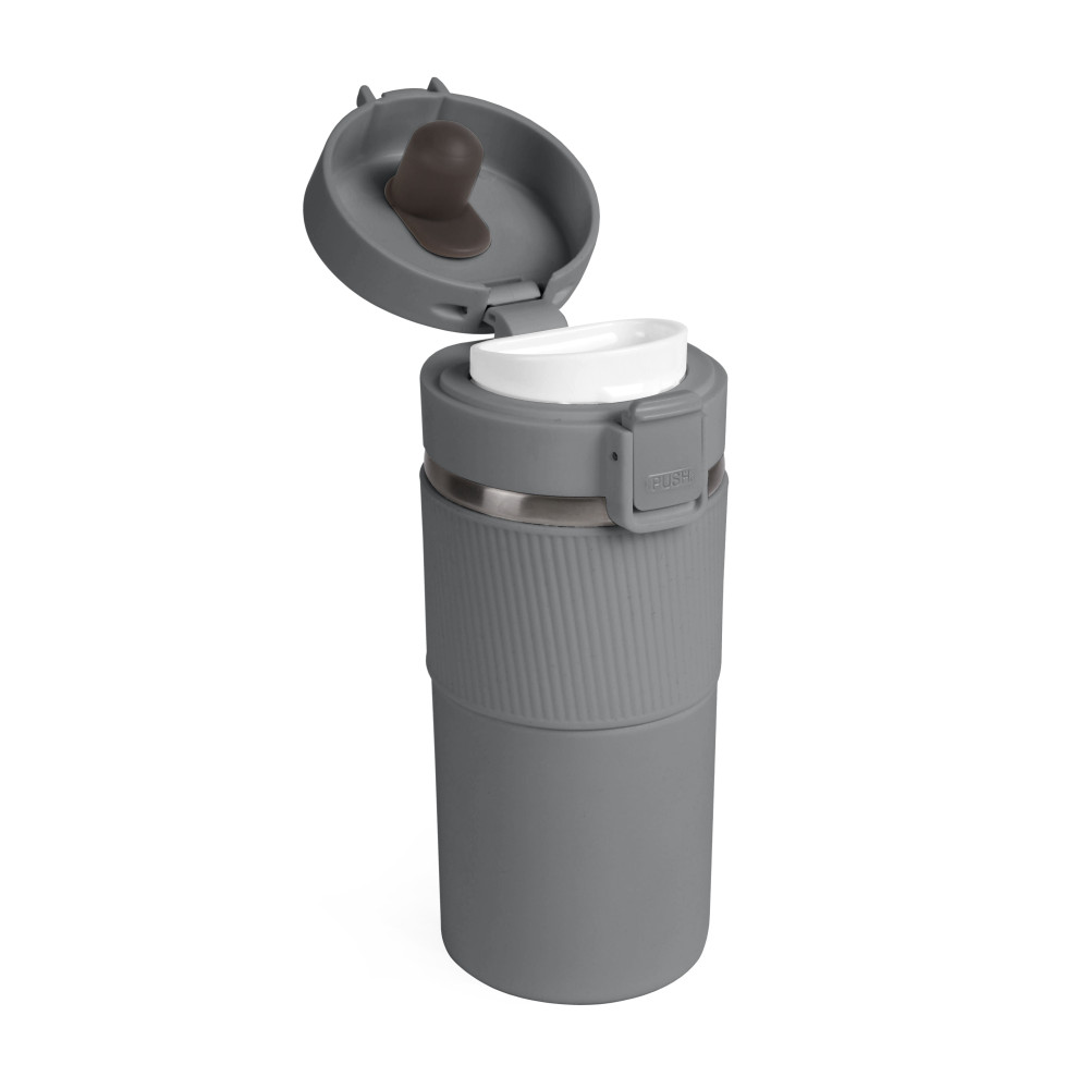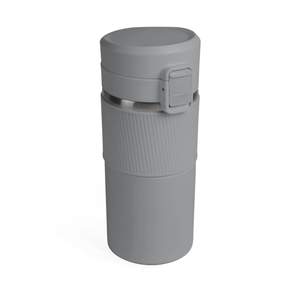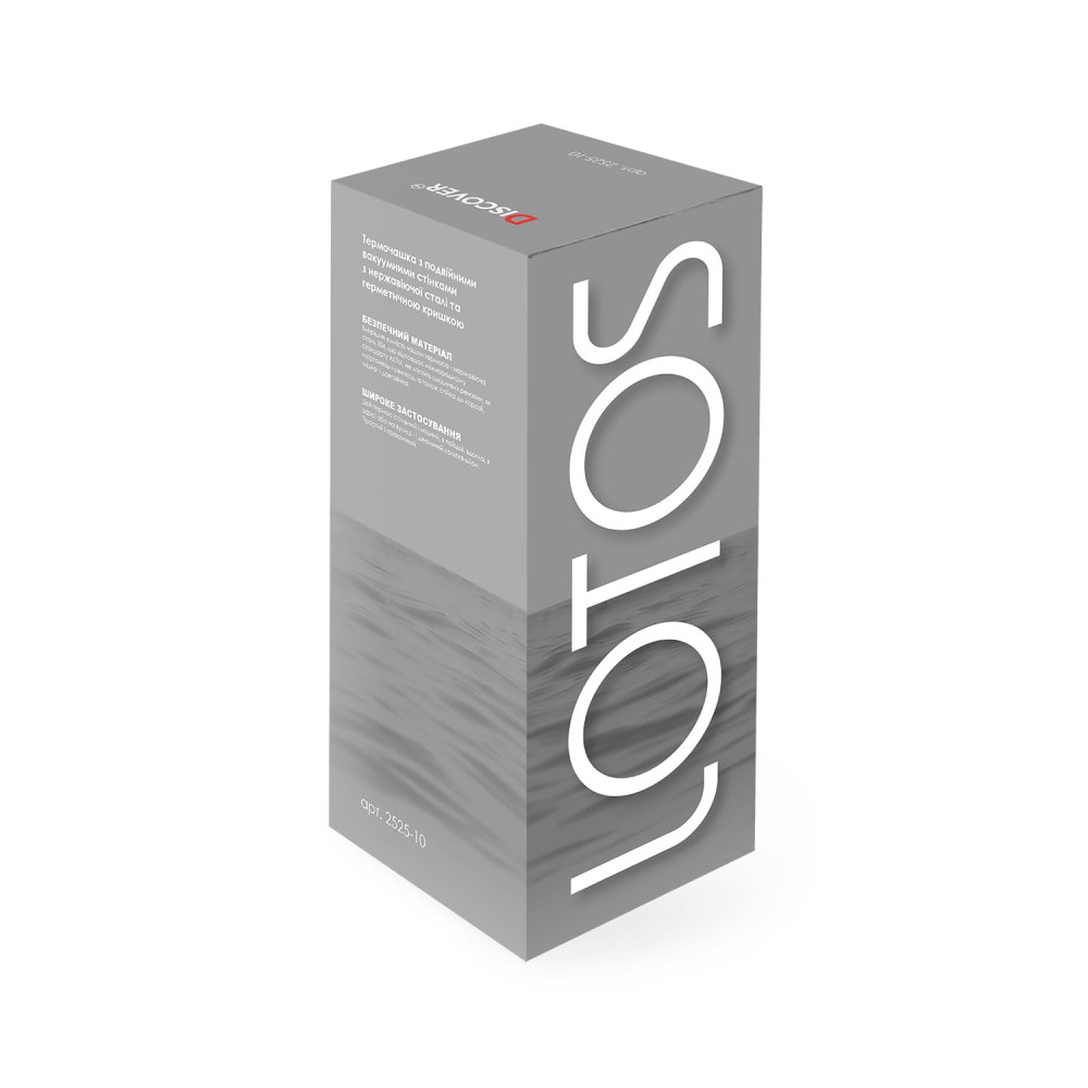 Вакуумна термокружка з нержавіючої сталі, вкрита матовою кольоровою емаллю. Кришка-непроливайка з ситечком, яка при необхідності блокується від випадкового відкривання. Об'єм 370 мл. Висота 18,3 см., діаметр 7,7 см. Підтримує температуру до 6 годин. Упакована в індивідуальну чорну коробку та поліетиленовий пакет. Розмір індивідуальної коробки: 19 х 8 х 8 см.