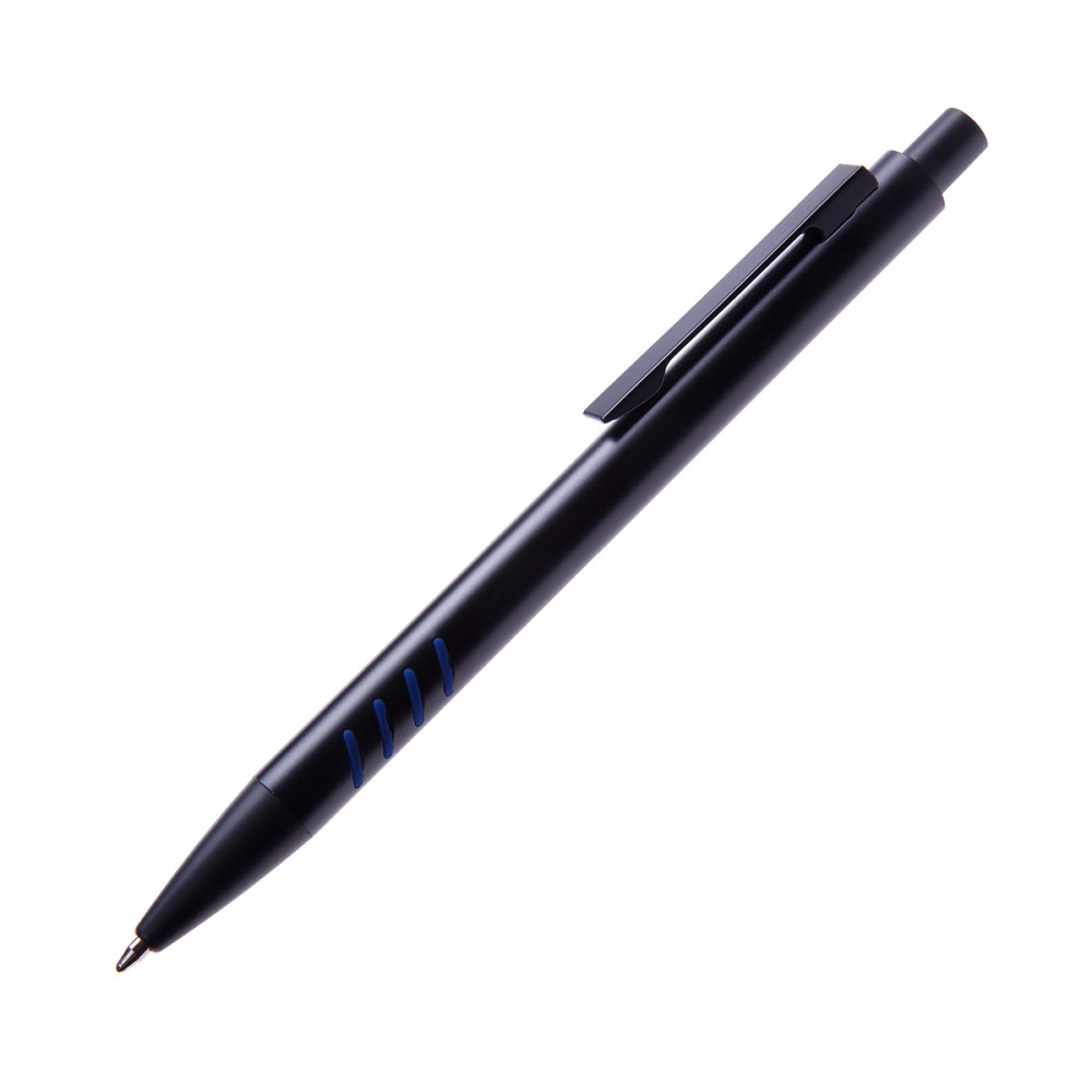 Ручка металева, матова зі спеціальною кольоровою підложкою, яка при гравіюванні лого в колір елементів виробу (кольорове гравіювання COLOR BASE) стержень з синім чорнилом
