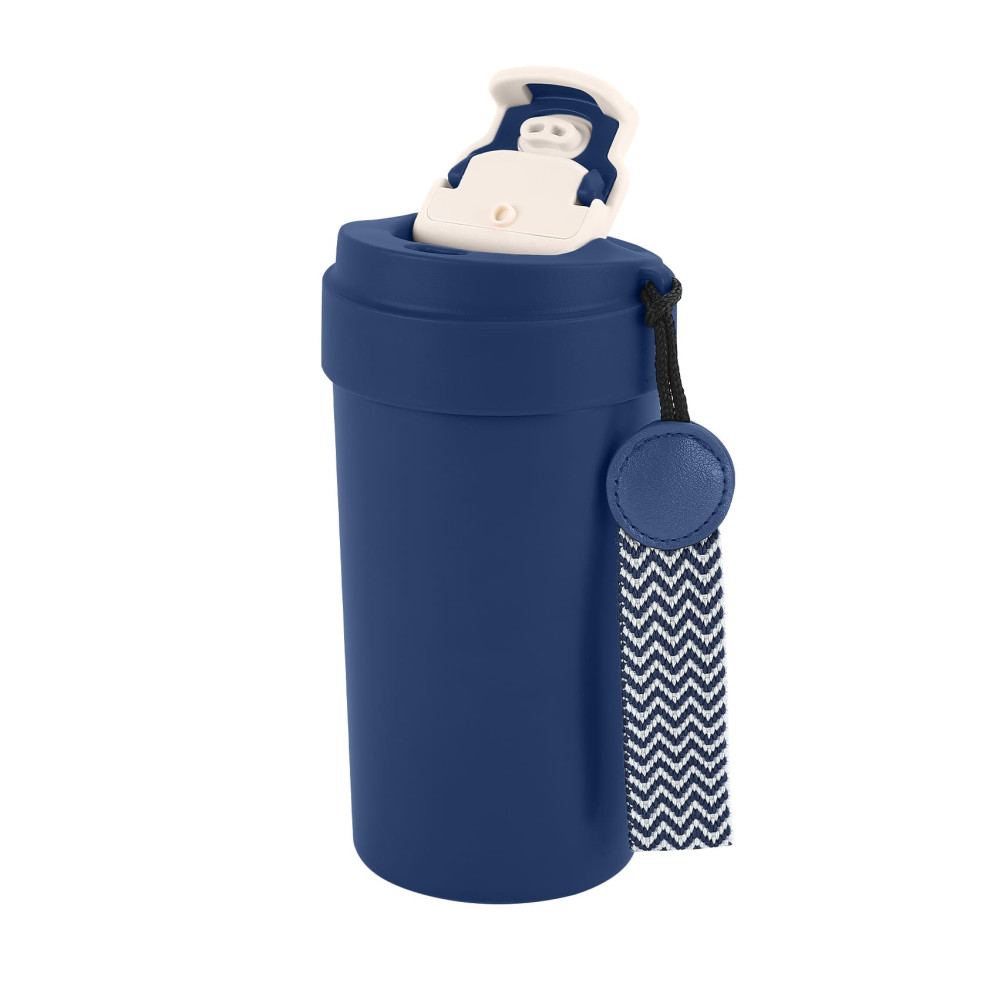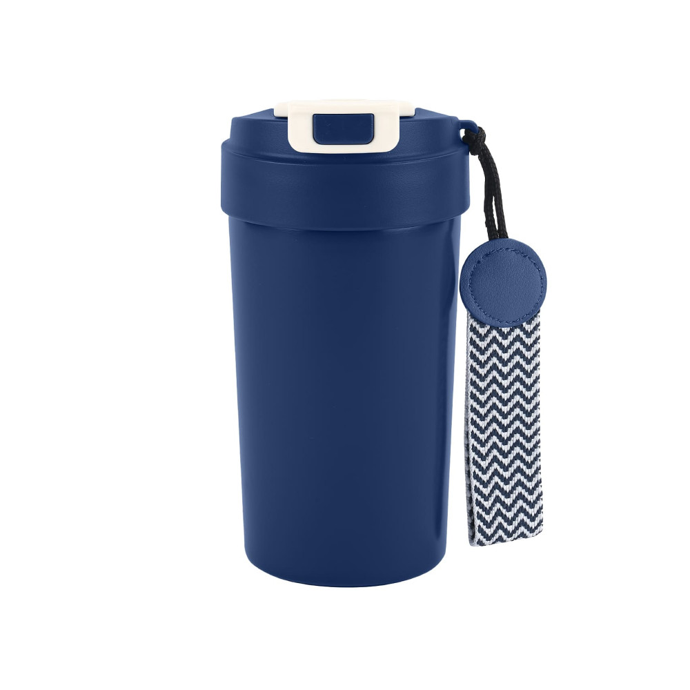 Термокружка з подвійною стінкою з нержавіючої сталі та вакуумною кришкою з кнопкою блокування.