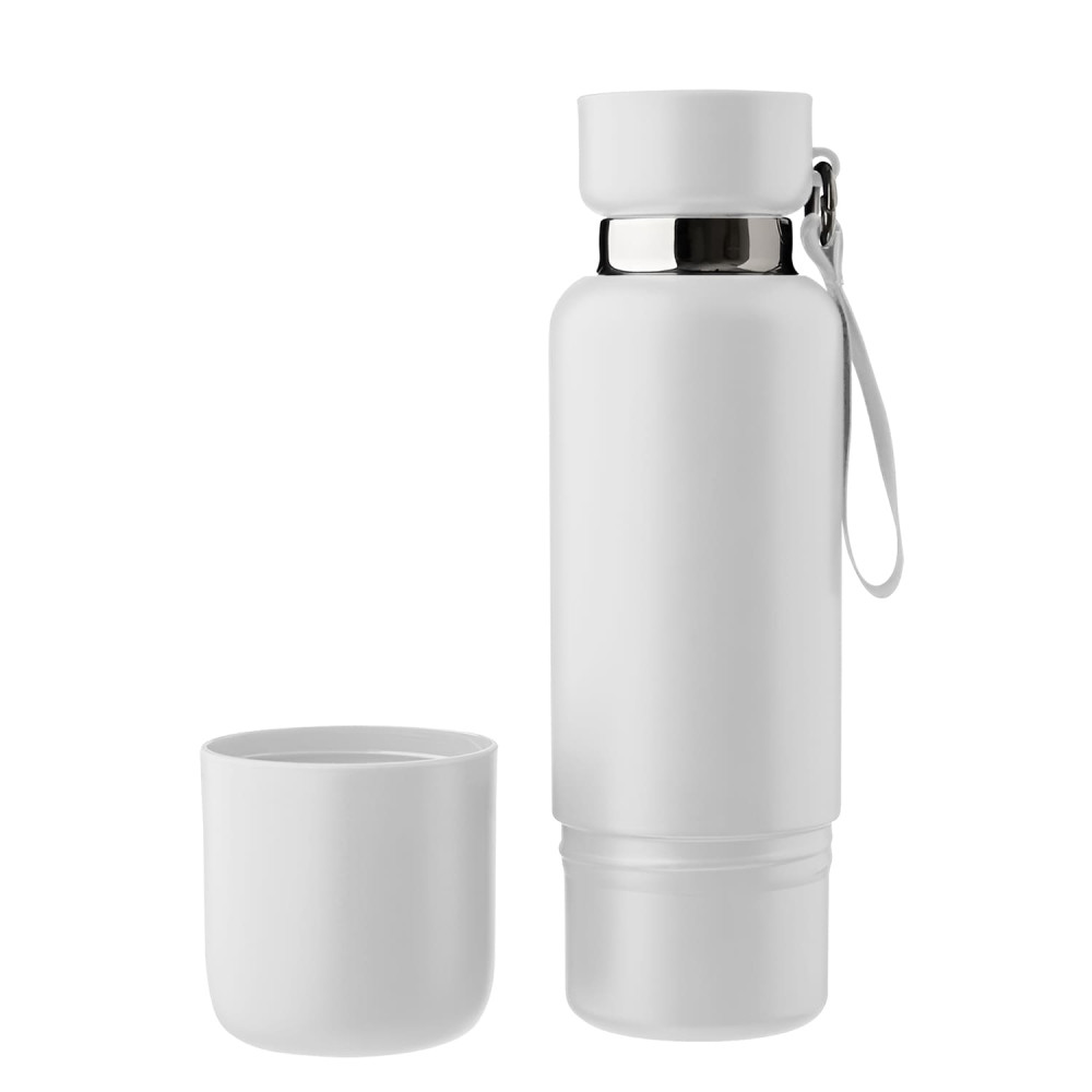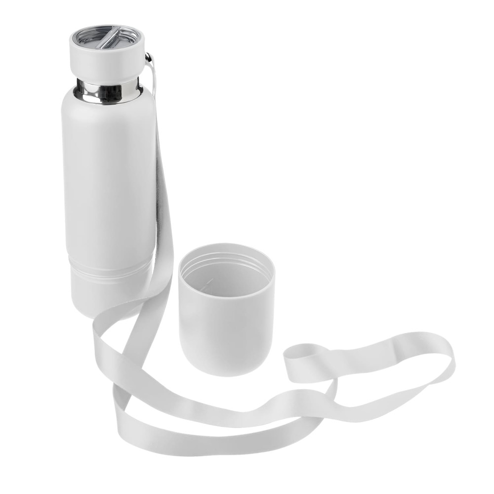 Термопляшка зі з’ємною чашкою, з подвійною стінкою з нержавіючої сталі. Має в комплекті короткий та довгий ремінець для перенесення Ідеальна для подорожей, офісу чи активного відпочинку.