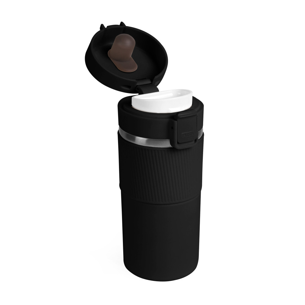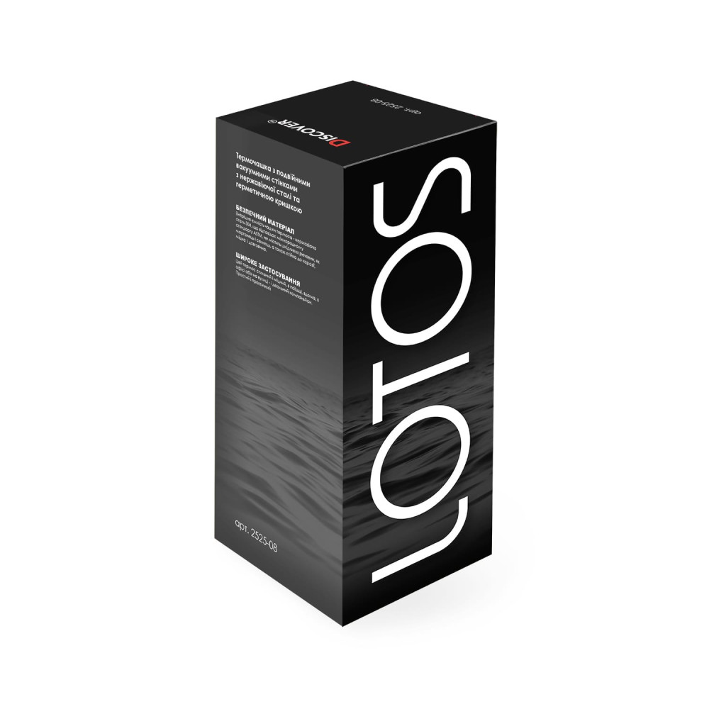 Вакуумна термокружка з нержавіючої сталі, вкрита матовою кольоровою емаллю. Кришка-непроливайка з ситечком, яка при необхідності блокується від випадкового відкривання. Об'єм 370 мл. Висота 18,3 см., діаметр 7,7 см. Підтримує температуру до 6 годин. Упакована в індивідуальну чорну коробку та поліетиленовий пакет. Розмір індивідуальної коробки: 19 х 8 х 8 см.