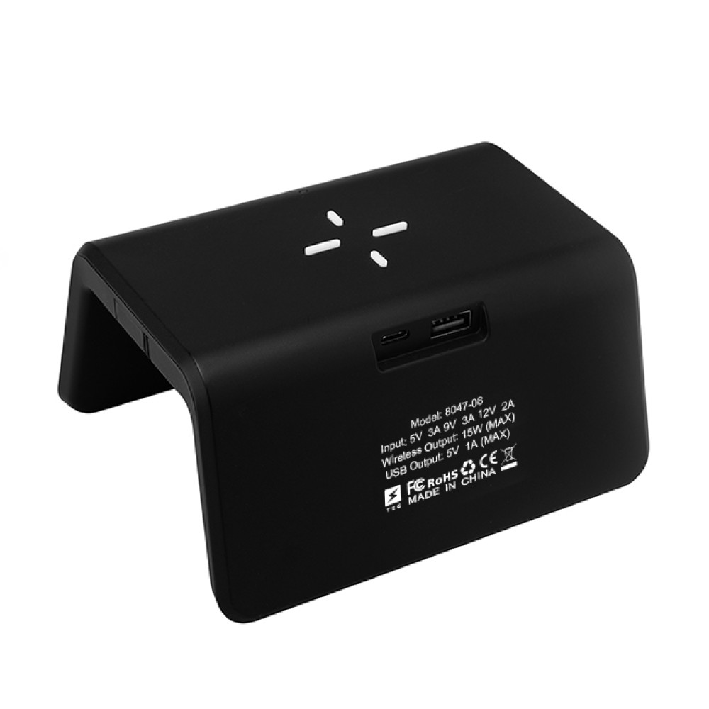 Функціональний годинник з бездротовою зарядкою 15W. Режим часу 12/24 год. Подвійний звуковий сигнал будильника для пробудження, функція відкладення. 8-кольоровий світловий нічник-лампа, USB-вихід для зарядки додаткових пристроїв, сенсорне управління, 4-рівневий режим яскравості дисплея. Аксесуари: кабель USB-A – Type-C (1 метр) Інструкція з експлуатації. Розмір виробу 14 х 11,7 х 7,3 см., вага 210 г. Нанесення : тамподрук, Уф-друк.
