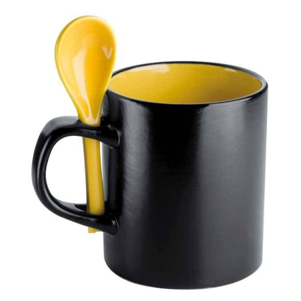 Керамічна чашка об'ємом 300 мл з ложкою в ручці. Можливість нанесення лазерного маркування або маркування деколем - максимум 1 колір.