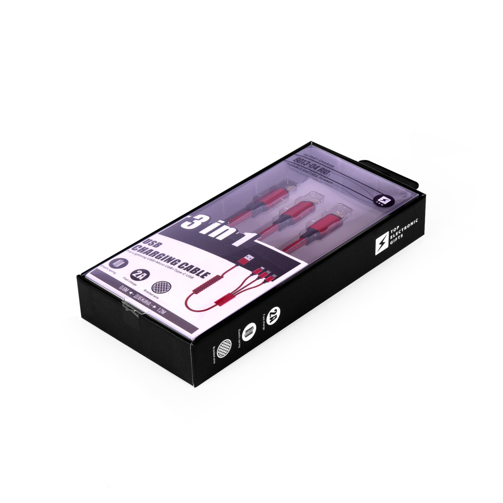 Універсальний кабель 3-в-1 для зарядки гаджетів, довжина в розтягнутому стані 1,2 м. Має стандартний USB вхід для підключення живлення та три різні виходи Lightning + Mscro USB + Type-C.
