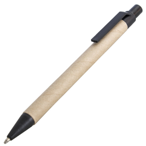 Корпус ручки із пресованого паперу доповнений кольоровими елементами із пластику.