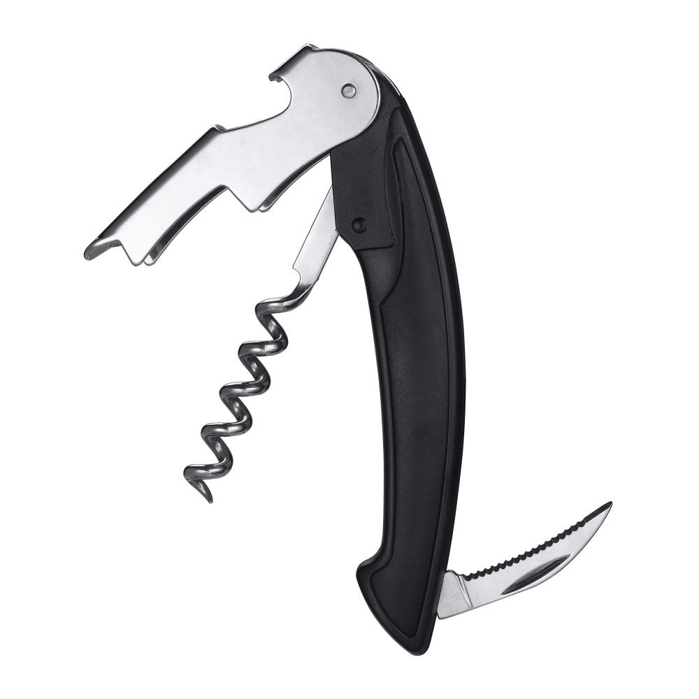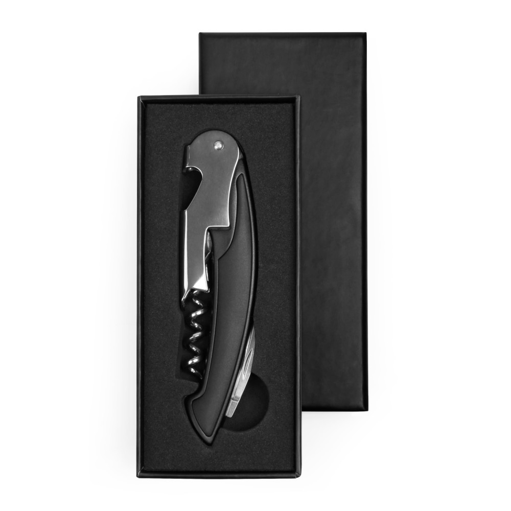Корпус з високоякісної нержавіючої сталі та алюмінієвою ручкою. Складаеться з штопору, відкривачки та ножа сомельє. В подарунковій картонній коробці
