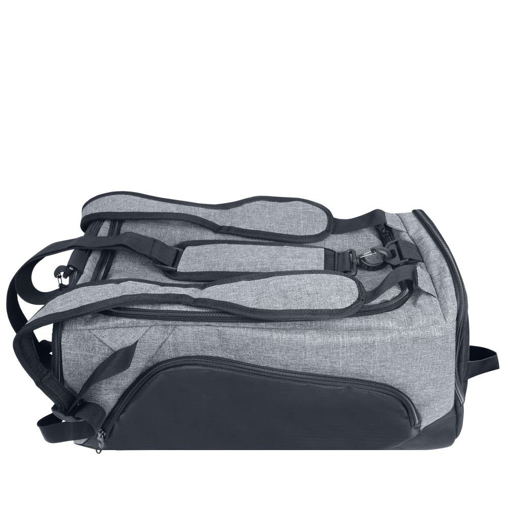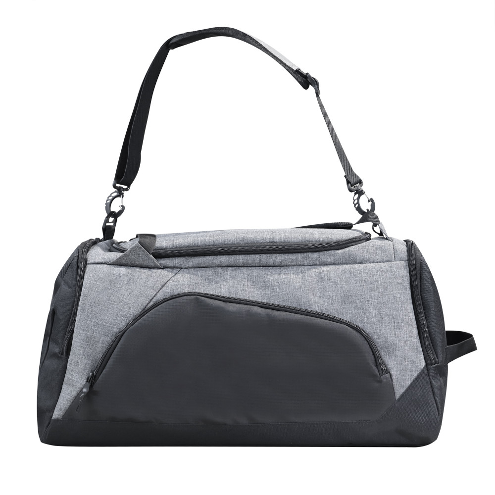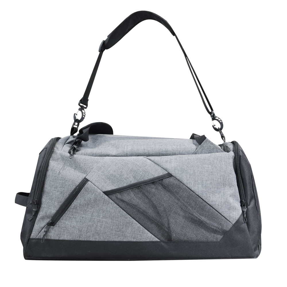 Багатофункціональна сумка з ущільнювачем з поролону. Має вмістке основне відділення, внутрішній м’який карман для ноутбука, дві бокові кишеня на блискавці (одна з яких для взуття), маленьку зовнішню кишеню на блискавці для окулярів, зовнішню кишеню-сітку для пляшки, основний регульований ремінь та дві регульовані наплічні шлейки. Підходить для спорту чи подорожей. Матеріал: Поліестер 600D + нейлон.
