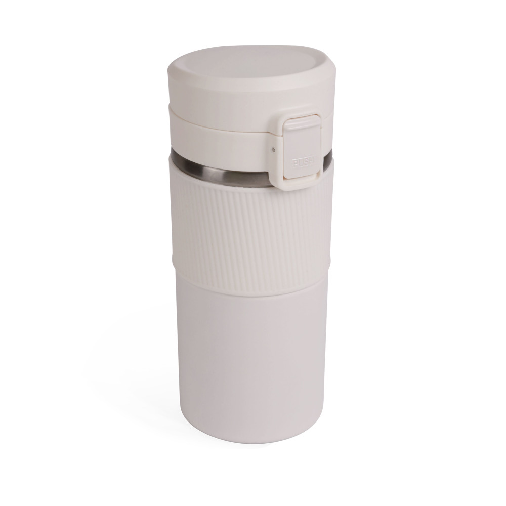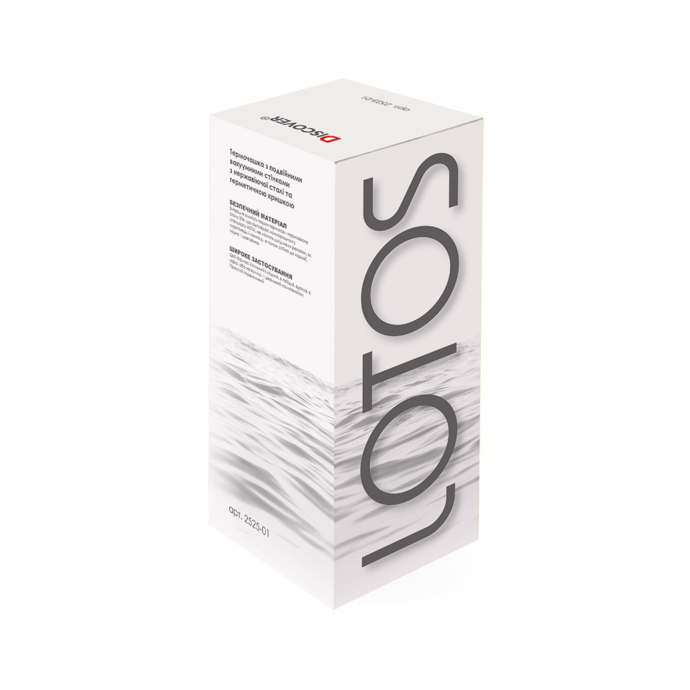Вакуумна термокружка з нержавіючої сталі, вкрита матовою кольоровою емаллю. Кришка-непроливайка з ситечком, яка при необхідності блокується від випадкового відкривання. Об'єм 370 мл. Висота 18,3 см., діаметр 7,7 см. Підтримує температуру до 6 годин. Упакована в індивідуальну чорну коробку та поліетиленовий пакет. Розмір індивідуальної коробки: 19 х 8 х 8 см.