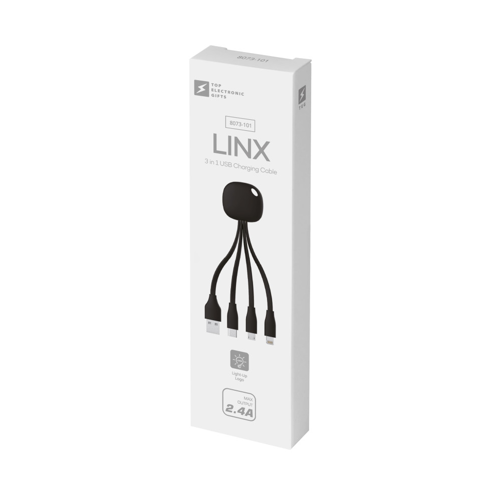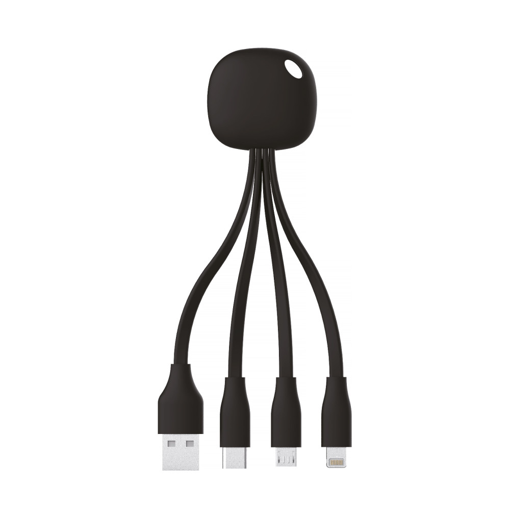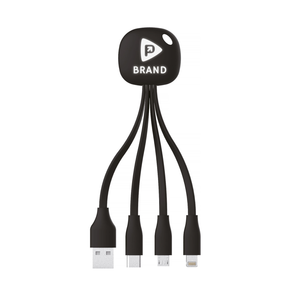 Універсальний кабель 3-в-1 для зарядки гаджетів із білою світлодіодною панеллю. Довжина 13,4 см. Має стандартний USB вхід для підключення живлення та три різні виходи Micro USB, Lightning, Type-C. При гравіювання відкриває підсвічування логотипу. Гравіювання можна компонувати з УФ-друком.